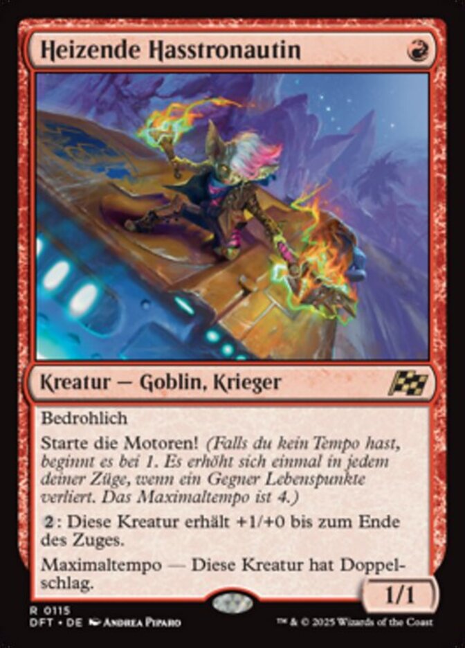 | Rules | Menace Start your engines! (If you have no speed, it starts at 1. It increases once on each of your turns when an opponent loses life. Max speed is 4.) : This creature gets +1/+0 until end of turn. Max speed — This creature has double strike. |