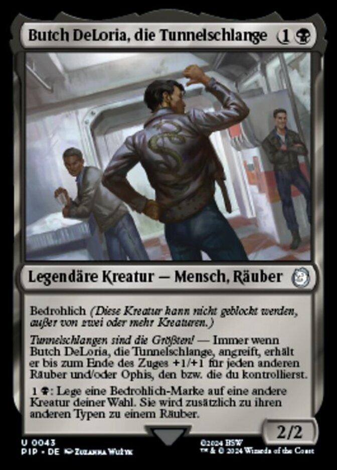 | Rules | Menace (This creature can't be blocked except by two or more creatures.) Tunnel Snakes Rule! — Whenever Butch DeLoria, Tunnel Snake attacks, it gets +1/+1 until end of turn for each other Rogue and/or Snake you control. : Put a menace counter on another target creature. It becomes a Rogue in addition to its other types. |