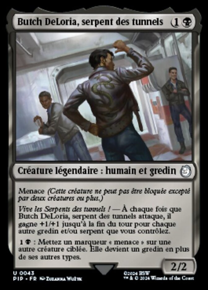 | Rules | Menace (This creature can't be blocked except by two or more creatures.) Tunnel Snakes Rule! — Whenever Butch DeLoria, Tunnel Snake attacks, it gets +1/+1 until end of turn for each other Rogue and/or Snake you control. : Put a menace counter on another target creature. It becomes a Rogue in addition to its other types. |