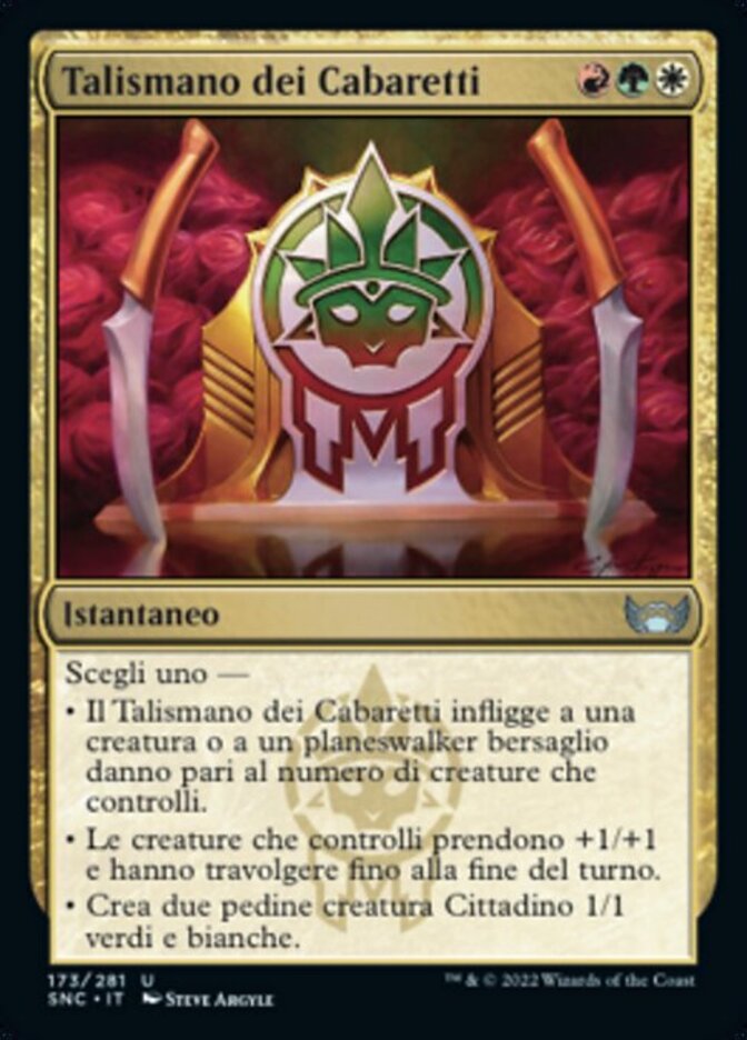 | Rules | Choose one — • Cabaretti Charm deals damage equal to the number of creatures you control to target creature or planeswalker. • Creatures you control get +1/+1 and gain trample until end of turn. • Create two 1/1 green and white Citizen creature tokens. |