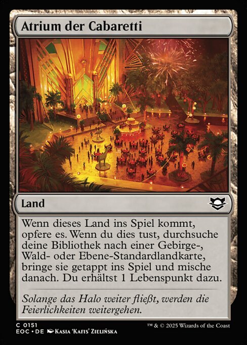 | Rules | When Cabaretti Courtyard enters the battlefield, sacrifice it. When you do, search your library for a basic Mountain, Forest, or Plains card, put it onto the battlefield tapped, then shuffle and you gain 1 life. |