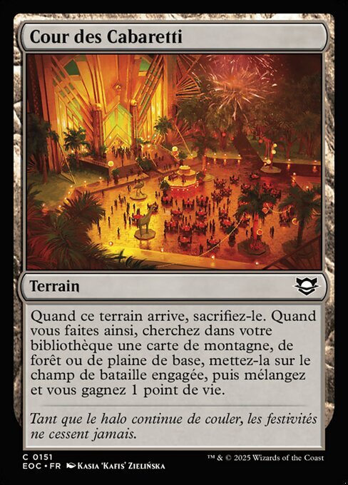 | Rules | When Cabaretti Courtyard enters the battlefield, sacrifice it. When you do, search your library for a basic Mountain, Forest, or Plains card, put it onto the battlefield tapped, then shuffle and you gain 1 life. |