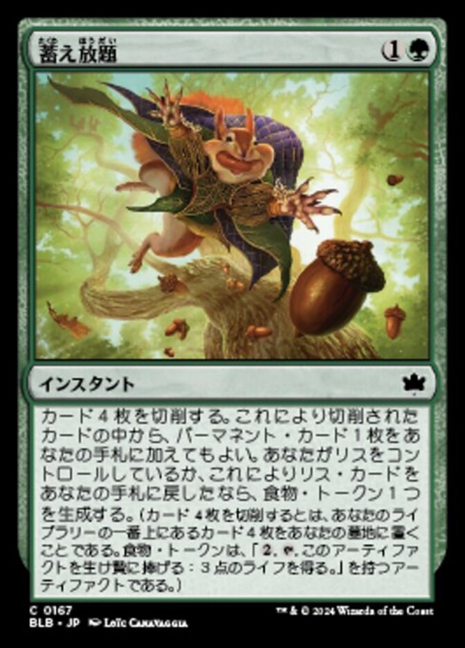 | Rules | Mill four cards. You may put a permanent card from among the cards milled this way into your hand. If you control a Squirrel or returned a Squirrel card to your hand this way, create a Food token. (To mill four cards, put the top four cards of your library into your graveyard. A Food token is an artifact with ", , Sacrifice this artifact: You gain 3 life.") |