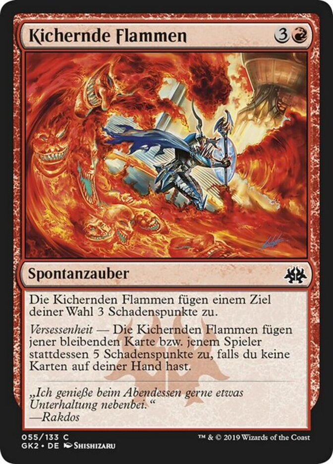 | Rules | Cackling Flames deals 3 damage to any target. Hellbent — Cackling Flames deals 5 damage instead if you have no cards in hand. |