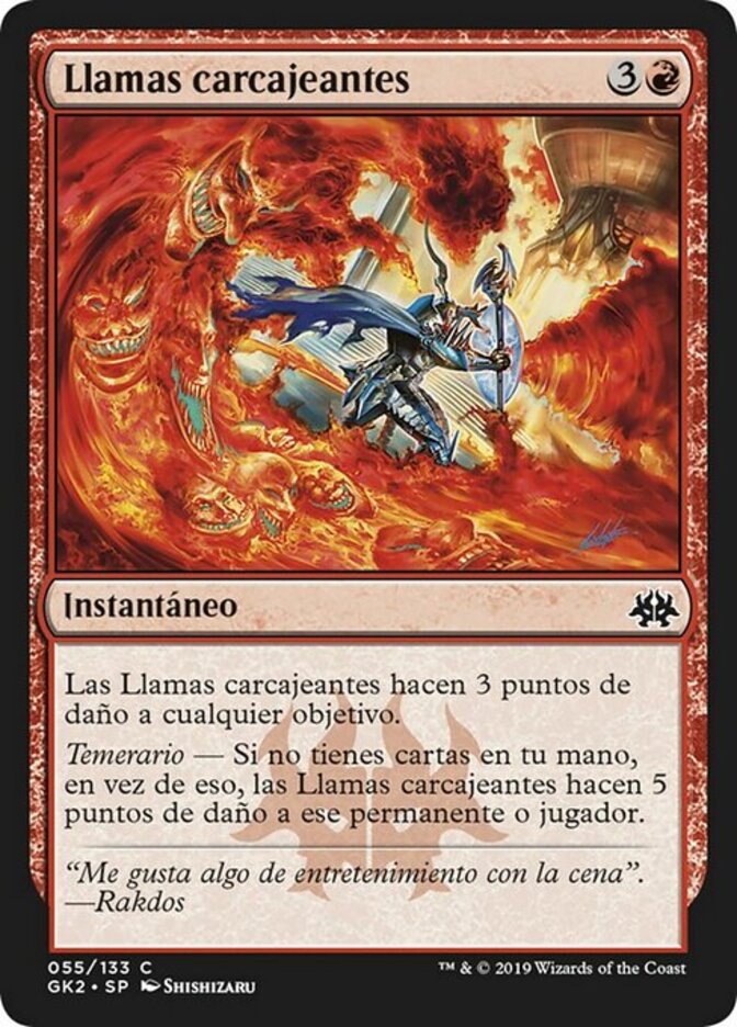 | Rules | Cackling Flames deals 3 damage to any target. Hellbent — Cackling Flames deals 5 damage instead if you have no cards in hand. |