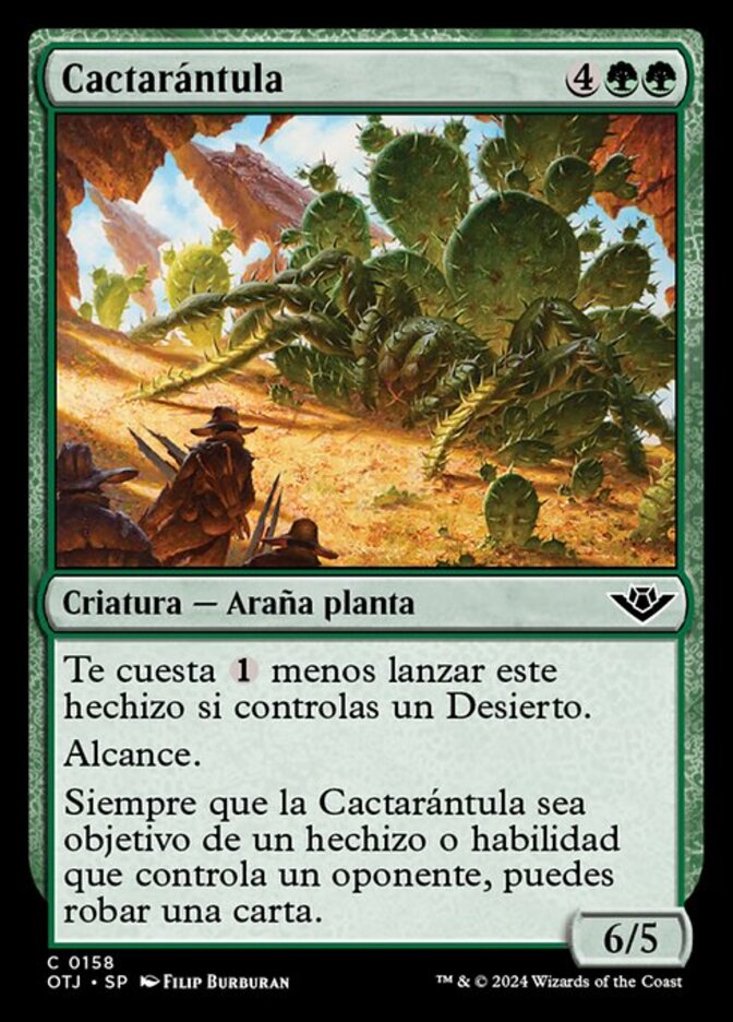 | Rules | This spell costs less to cast if you control a Desert. Reach Whenever Cactarantula becomes the target of a spell or ability an opponent controls, you may draw a card. |