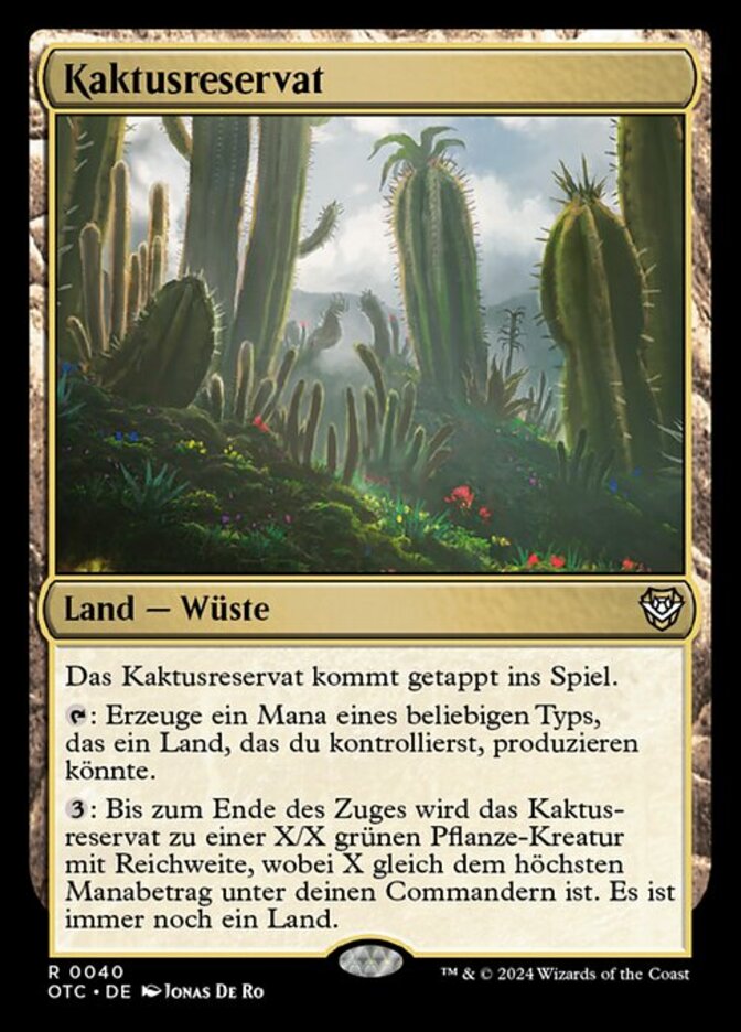 | Rules | Cactus Preserve enters the battlefield tapped. : Add one mana of any type that a land you control could produce. : Until end of turn, Cactus Preserve becomes an X/X green Plant creature with reach, where X is the greatest mana value among your commanders. It's still a land. |