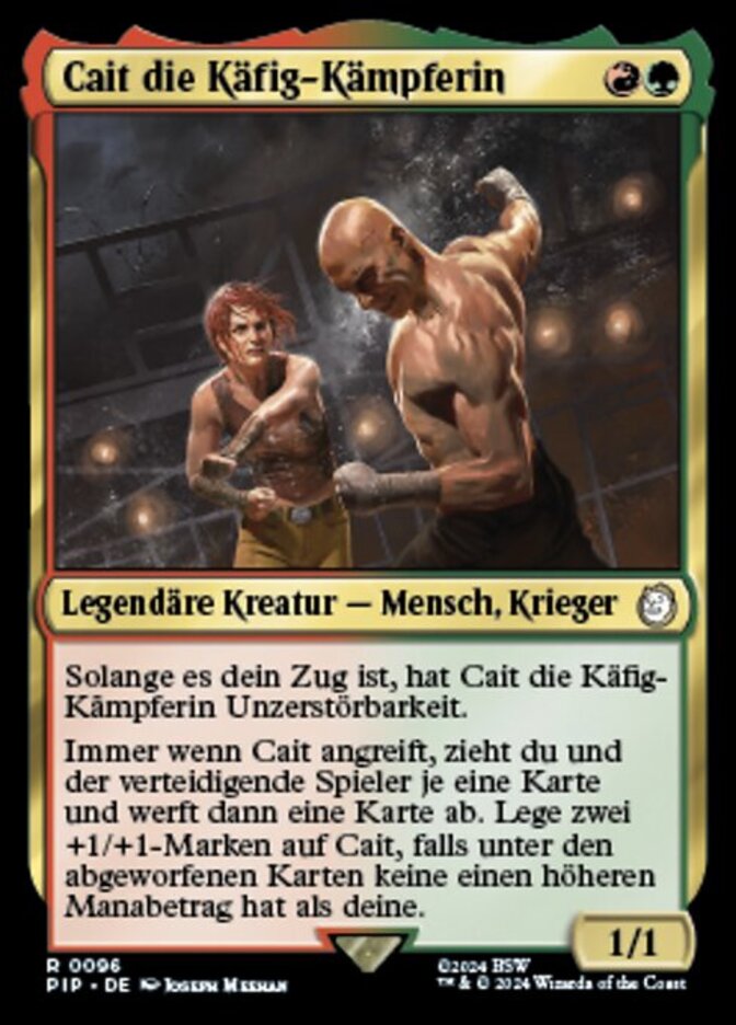| Rules | As long as it's your turn, Cait, Cage Brawler has indestructible. Whenever Cait attacks, you and defending player each draw a card, then discard a card. Put two +1/+1 counters on Cait if you discarded the card with the highest mana value among those cards or tied for highest. |