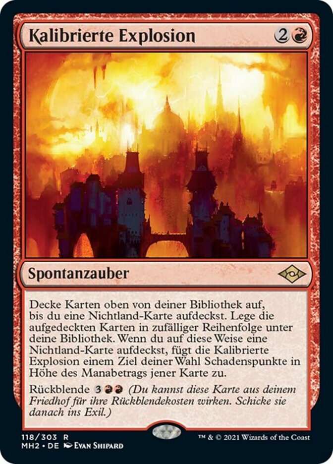 | Rules | Reveal cards from the top of your library until you reveal a nonland card. Put the revealed cards on the bottom of your library in a random order. When you reveal a nonland card this way, Calibrated Blast deals damage equal to that card's mana value to any target. Flashback (You may cast this card from your graveyard for its flashback cost. Then exile it.) |