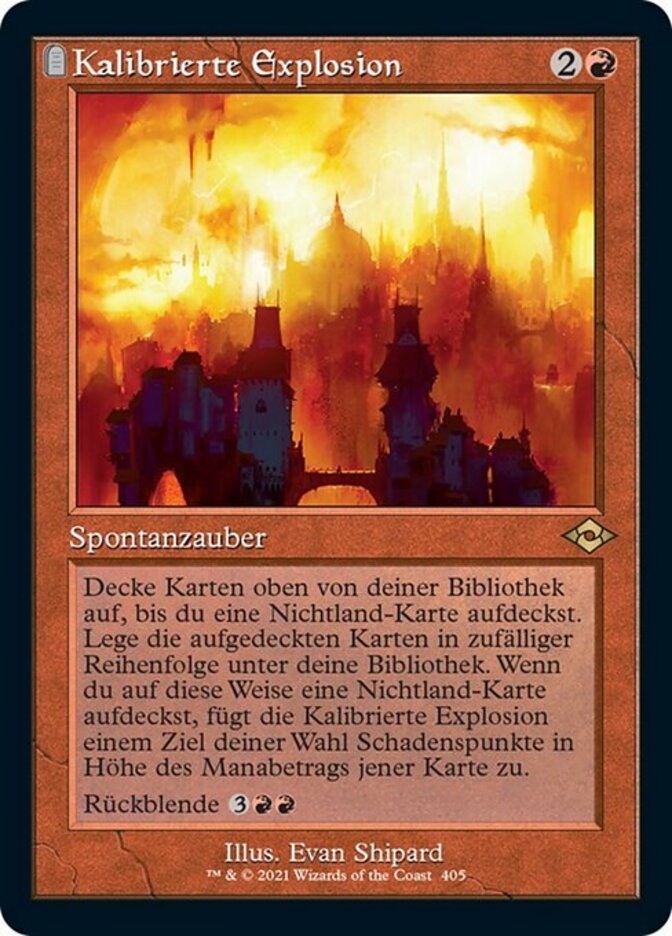 | Rules | Reveal cards from the top of your library until you reveal a nonland card. Put the revealed cards on the bottom of your library in a random order. When you reveal a nonland card this way, Calibrated Blast deals damage equal to that card's mana value to any target. Flashback (You may cast this card from your graveyard for its flashback cost. Then exile it.) |