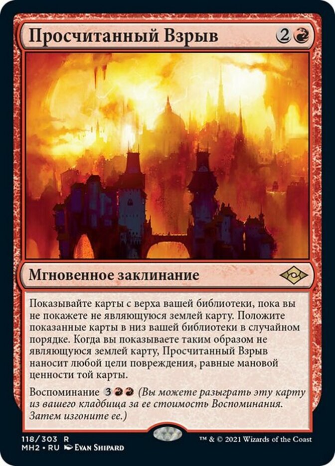 | Rules | Reveal cards from the top of your library until you reveal a nonland card. Put the revealed cards on the bottom of your library in a random order. When you reveal a nonland card this way, Calibrated Blast deals damage equal to that card's mana value to any target. Flashback (You may cast this card from your graveyard for its flashback cost. Then exile it.) |
