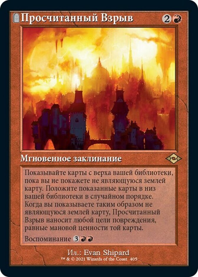 | Rules | Reveal cards from the top of your library until you reveal a nonland card. Put the revealed cards on the bottom of your library in a random order. When you reveal a nonland card this way, Calibrated Blast deals damage equal to that card's mana value to any target. Flashback (You may cast this card from your graveyard for its flashback cost. Then exile it.) |