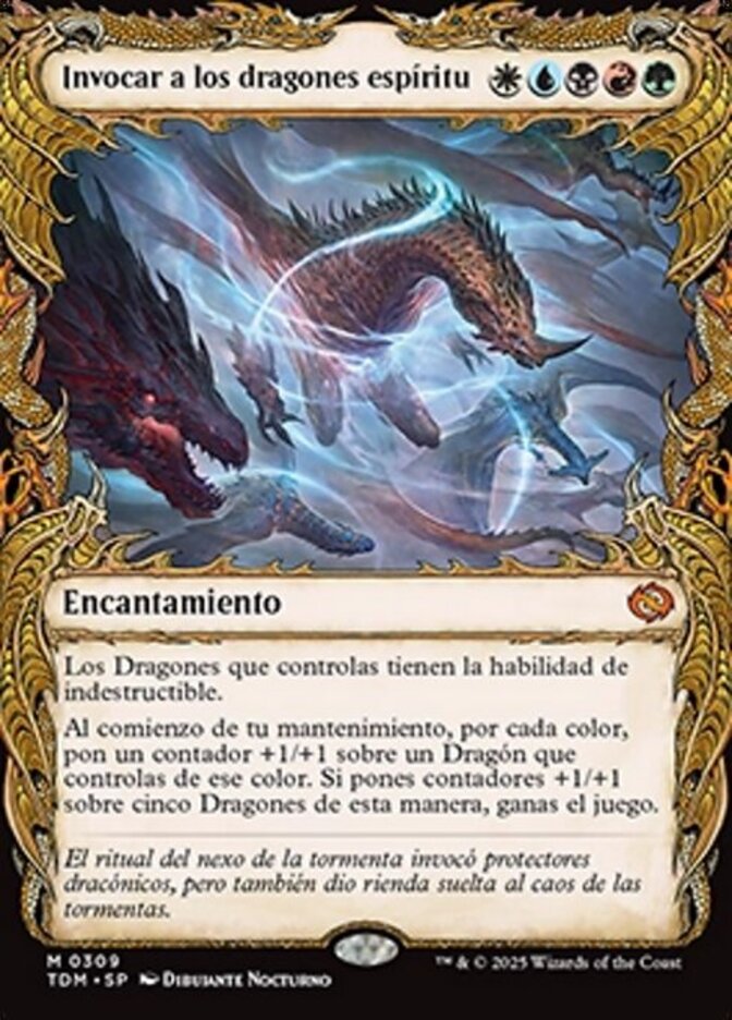 | Rules | Dragons you control have indestructible. At the beginning of your upkeep, for each color, put a +1/+1 counter on a Dragon you control of that color. If you put +1/+1 counters on five Dragons this way, you win the game. |