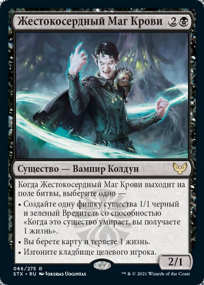 | Rules | When Callous Bloodmage enters the battlefield, choose one — • Create a 1/1 black and green Pest creature token with "When this creature dies, you gain 1 life." • You draw a card and you lose 1 life. • Exile target player's graveyard. |