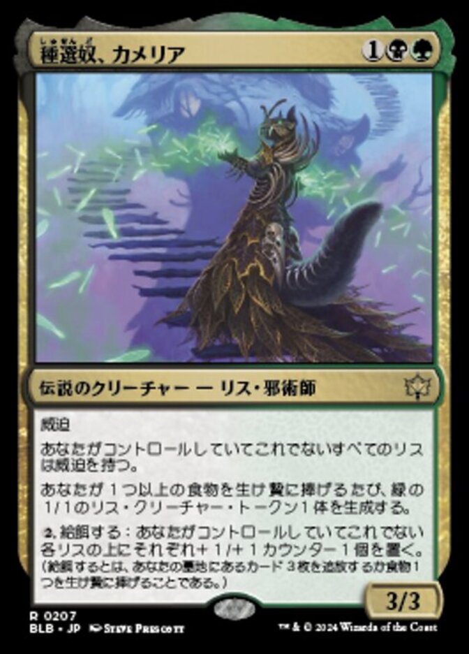 | Rules | Menace Other Squirrels you control have menace. Whenever you sacrifice one or more Foods, create a 1/1 green Squirrel creature token. , Forage: Put a +1/+1 counter on each other Squirrel you control. (To forage, exile three cards from your graveyard or sacrifice a Food.) |