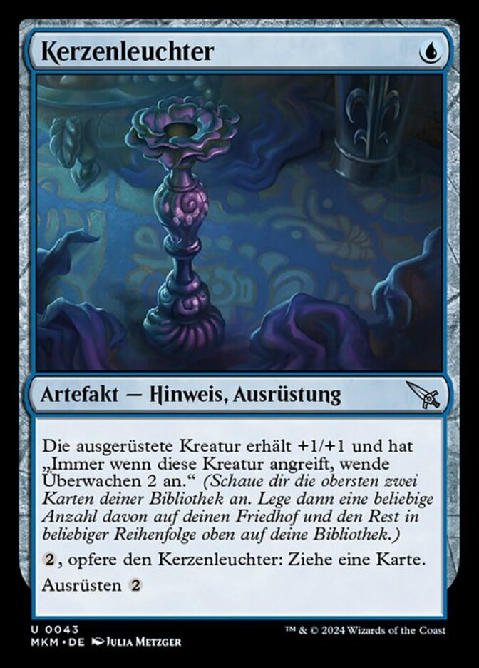 | Rules | Equipped creature gets +1/+1 and has "Whenever this creature attacks, surveil 2." (Look at the top two cards of your library, then put any number of them into your graveyard and the rest on top of your library in any order.) , Sacrifice Candlestick: Draw a card. Equip |