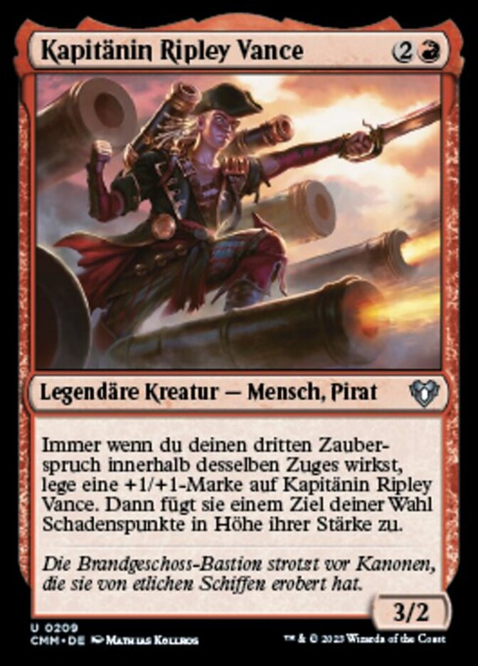 | Rules | Whenever you cast your third spell each turn, put a +1/+1 counter on Captain Ripley Vance, then it deals damage equal to its power to any target. |
