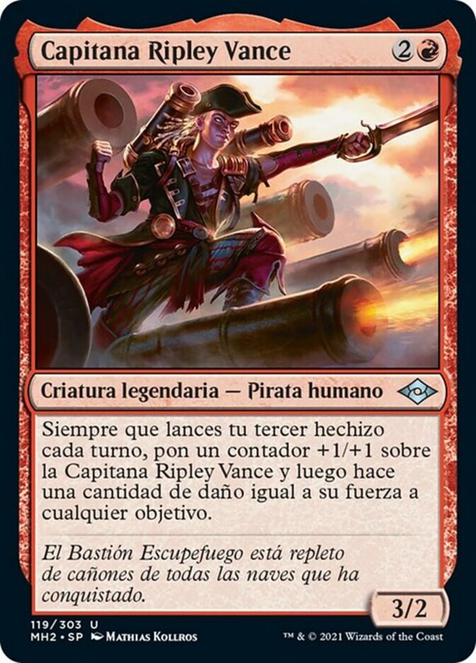 | Rules | Whenever you cast your third spell each turn, put a +1/+1 counter on Captain Ripley Vance, then it deals damage equal to its power to any target. |
