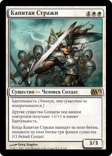| Rules | Vigilance (Attacking doesn't cause this creature to tap.) Other Soldier creatures you control get +1/+1 and have vigilance. When Captain of the Watch enters the battlefield, create three 1/1 white Soldier creature tokens. |