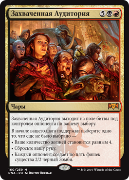 | Rules | Captive Audience enters the battlefield under the control of an opponent of your choice. At the beginning of your upkeep, choose one that hasn't been chosen — • Your life total becomes 4. • Discard your hand. • Each opponent creates five 2/2 black Zombie creature tokens. |