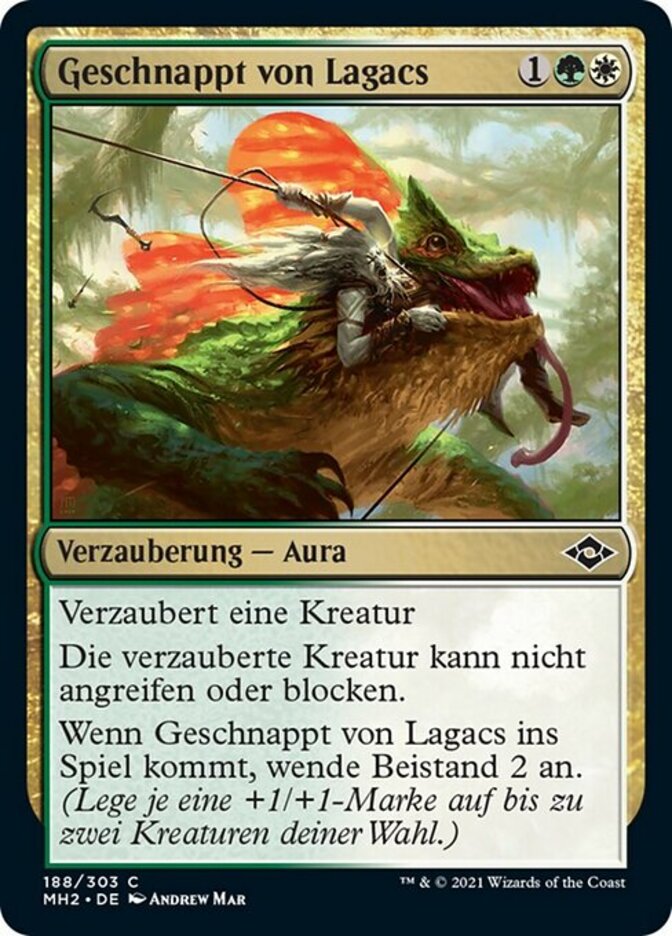 | Rules | Enchant creature Enchanted creature can't attack or block. When Captured by Lagacs enters the battlefield, support 2. (Put a +1/+1 counter on each of up to two target creatures.) |