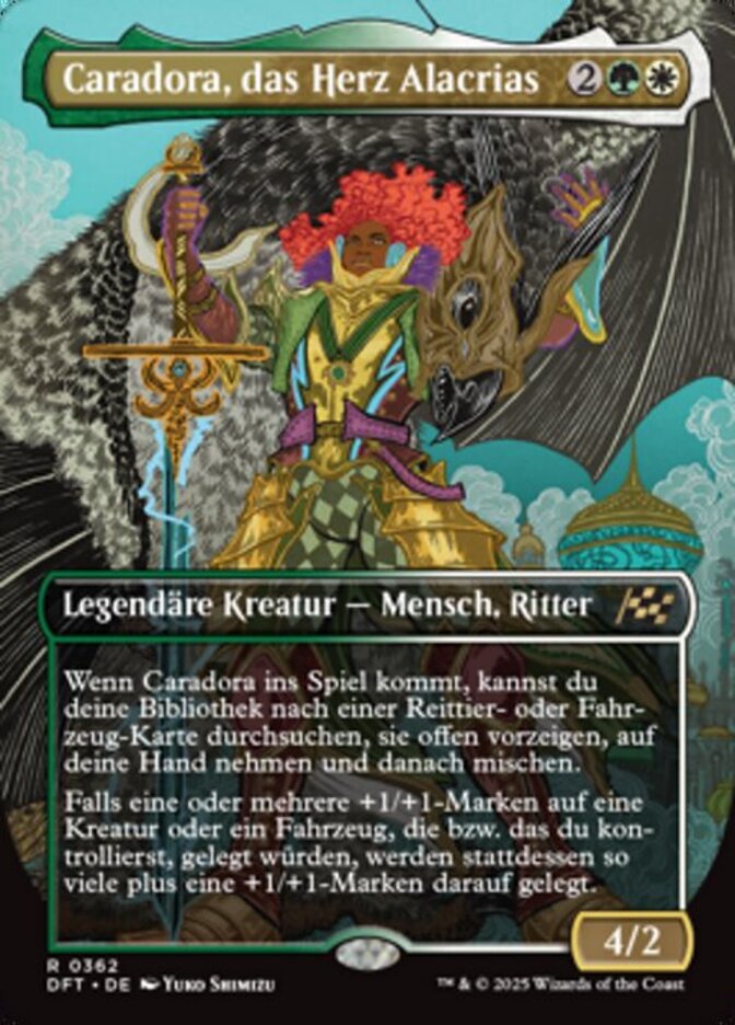| Rules | When Caradora enters, you may search your library for a Mount or Vehicle card, reveal it, put it into your hand, then shuffle. If one or more +1/+1 counters would be put on a creature or Vehicle you control, that many plus one +1/+1 counters are put on it instead. |