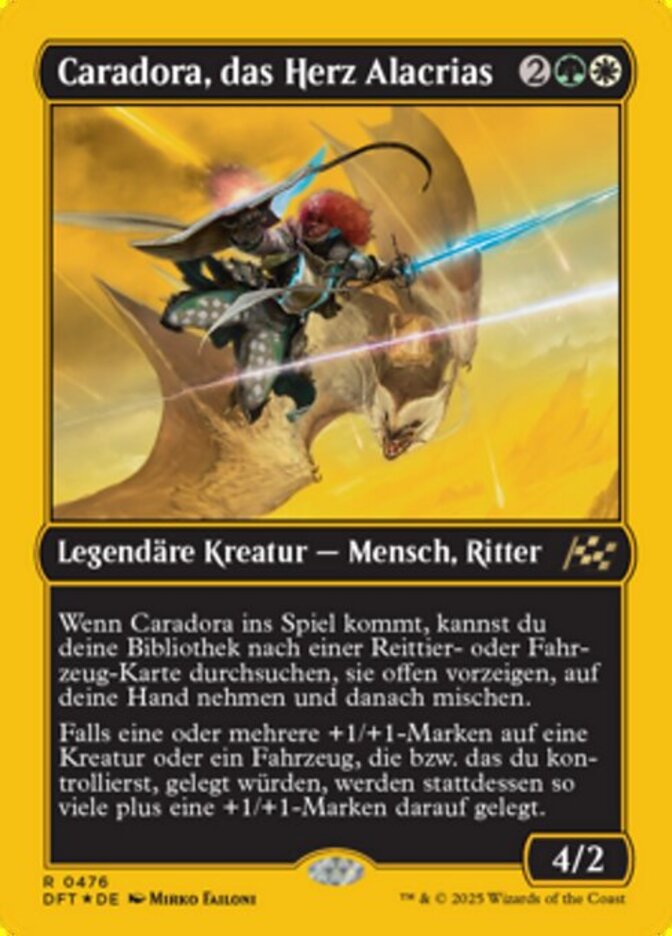 | Rules | When Caradora enters, you may search your library for a Mount or Vehicle card, reveal it, put it into your hand, then shuffle. If one or more +1/+1 counters would be put on a creature or Vehicle you control, that many plus one +1/+1 counters are put on it instead. |