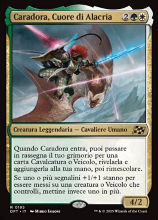 | Rules | When Caradora enters, you may search your library for a Mount or Vehicle card, reveal it, put it into your hand, then shuffle. If one or more +1/+1 counters would be put on a creature or Vehicle you control, that many plus one +1/+1 counters are put on it instead. |