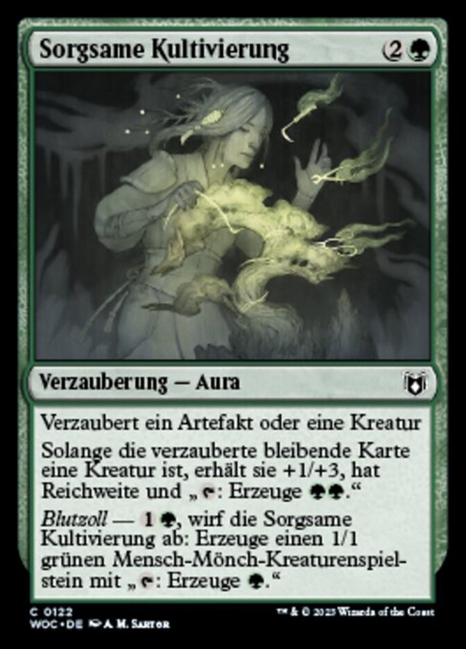 | Rules | Enchant artifact or creature As long as enchanted permanent is a creature, it gets +1/+3 and has reach and ": Add ." Channel — , Discard Careful Cultivation: Create a 1/1 green Human Monk creature token with ": Add ." |