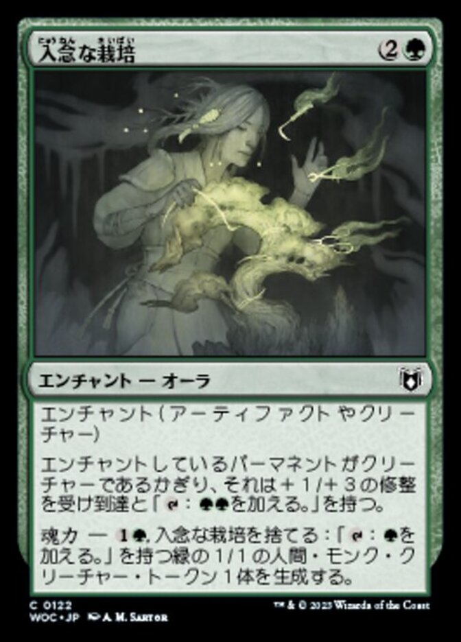 | Rules | Enchant artifact or creature As long as enchanted permanent is a creature, it gets +1/+3 and has reach and ": Add ." Channel — , Discard Careful Cultivation: Create a 1/1 green Human Monk creature token with ": Add ." |