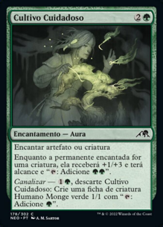 | Rules | Enchant artifact or creature As long as enchanted permanent is a creature, it gets +1/+3 and has reach and ": Add ." Channel — , Discard Careful Cultivation: Create a 1/1 green Human Monk creature token with ": Add ." |