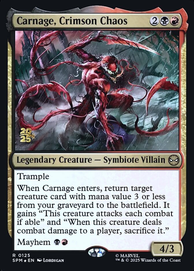 Rules | Trample When Carnage enters, return target creature card with mana value 3 or less from your graveyard to the battlefield. It gains "This creature attacks each combat if able" and "When this creature deals combat damage to a player, sacrifice it." Mayhem |