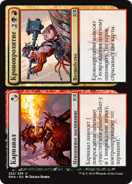 | Rules | Carnival deals 1 damage to target creature or planeswalker and 1 damage to that permanent's controller. // Carnage deals 3 damage to target opponent. That player discards two cards. |