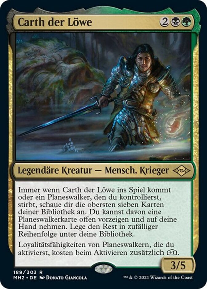 | Rules | Whenever Carth the Lion enters the battlefield or a planeswalker you control dies, look at the top seven cards of your library. You may reveal a planeswalker card from among them and put it into your hand. Put the rest on the bottom of your library in a random order. Planeswalkers' loyalty abilities you activate cost an additional +1 to activate. |