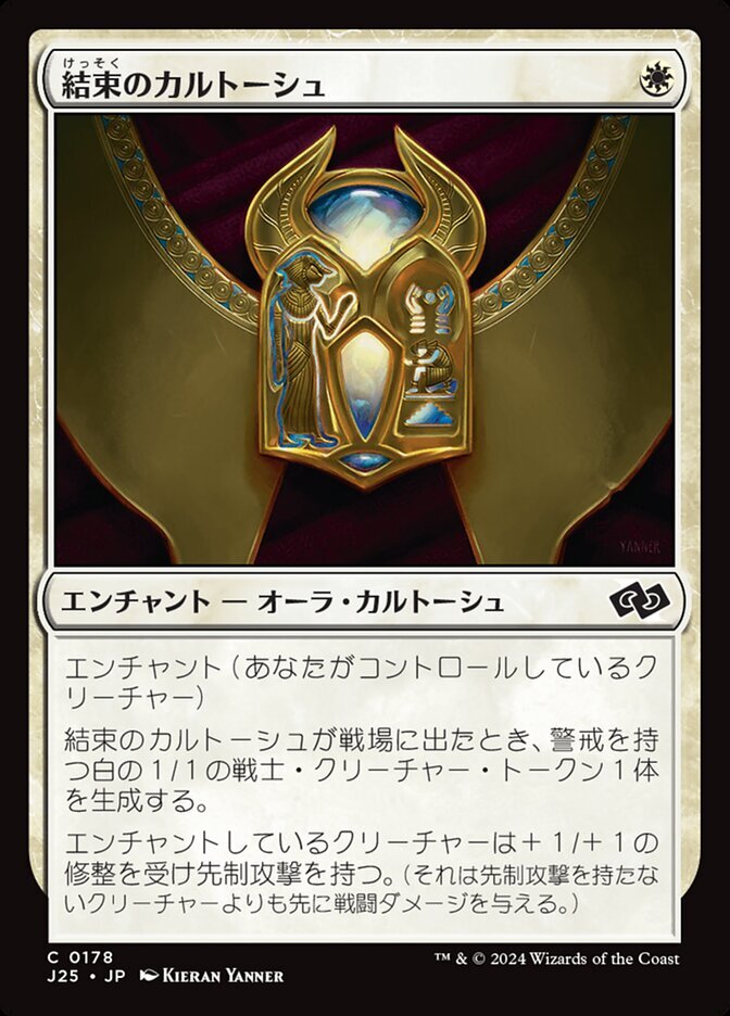 | Rules | Enchant creature you control When Cartouche of Solidarity enters the battlefield, create a 1/1 white Warrior creature token with vigilance. Enchanted creature gets +1/+1 and has first strike. |