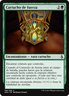 | Rules | Enchant creature you control When Cartouche of Strength enters the battlefield, you may have enchanted creature fight target creature an opponent controls. (Each deals damage equal to its power to the other.) Enchanted creature gets +1/+1 and has trample. |