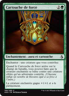 | Rules | Enchant creature you control When Cartouche of Strength enters the battlefield, you may have enchanted creature fight target creature an opponent controls. (Each deals damage equal to its power to the other.) Enchanted creature gets +1/+1 and has trample. |