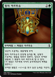 | Rules | Enchant creature you control When Cartouche of Strength enters the battlefield, you may have enchanted creature fight target creature an opponent controls. (Each deals damage equal to its power to the other.) Enchanted creature gets +1/+1 and has trample. |