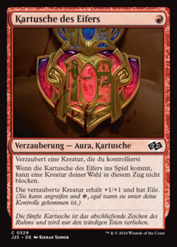| Rules | Enchant creature you control When Cartouche of Zeal enters the battlefield, target creature can't block this turn. Enchanted creature gets +1/+1 and has haste. |