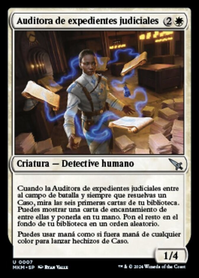 | Rules | When Case File Auditor enters the battlefield and whenever you solve a Case, look at the top six cards of your library. You may reveal an enchantment card from among them and put it into your hand. Put the rest on the bottom of your library in a random order. You may spend mana as though it were mana of any color to cast Case spells. |