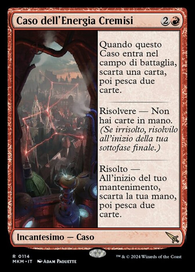 | Rules | When this Case enters the battlefield, discard a card, then draw two cards. To solve — You have no cards in hand. (If unsolved, solve at the beginning of your end step.) Solved — At the beginning of your upkeep, discard your hand, then draw two cards. |