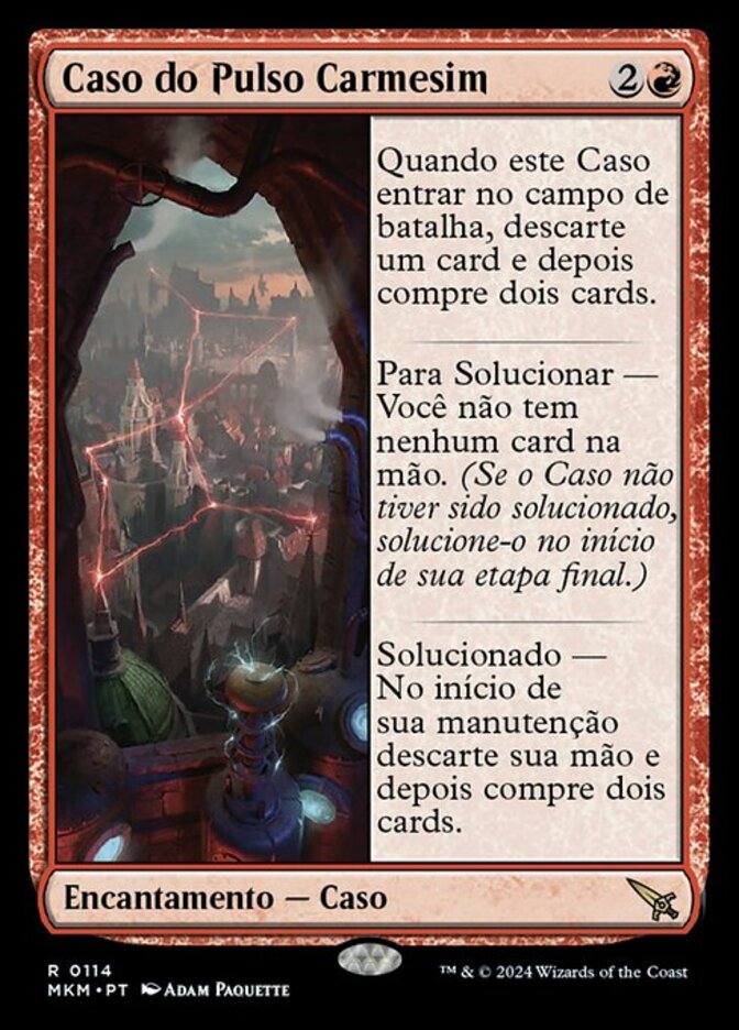 | Rules | When this Case enters the battlefield, discard a card, then draw two cards. To solve — You have no cards in hand. (If unsolved, solve at the beginning of your end step.) Solved — At the beginning of your upkeep, discard your hand, then draw two cards. |