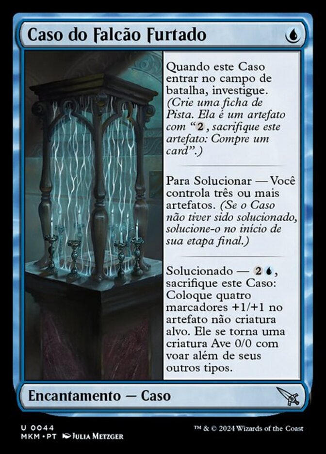 | Rules | When this Case enters the battlefield, investigate. (Create a Clue token. It's an artifact with ", Sacrifice this artifact: Draw a card.") To solve — You control three or more artifacts. (If unsolved, solve at the beginning of your end step.) Solved — , Sacrifice this Case: Put four +1/+1 counters on target noncreature artifact. It becomes a 0/0 Bird creature with flying in addition to its other types. |