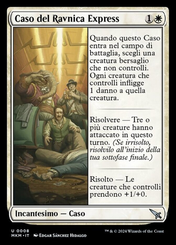 | Rules | When this Case enters the battlefield, choose target creature you don't control. Each creature you control deals 1 damage to that creature. To solve — Three or more creatures attacked this turn. (If unsolved, solve at the beginning of your end step.) Solved — Creatures you control get +1/+0. |