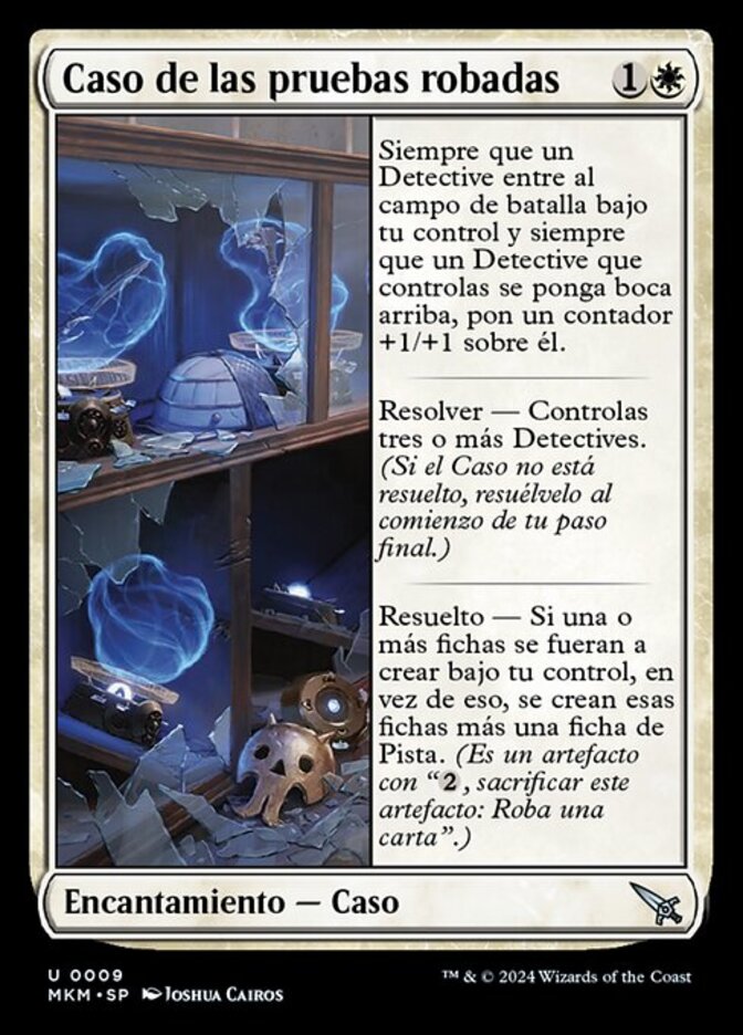 | Rules | Whenever a Detective enters the battlefield under your control and whenever a Detective you control is turned face up, put a +1/+1 counter on it. To solve — You control three or more Detectives. (If unsolved, solve at the beginning of your end step.) Solved — If one or more tokens would be created under your control, those tokens plus a Clue token are created instead. (It's an artifact with ", Sacrifice this artifact: Draw a card.") |