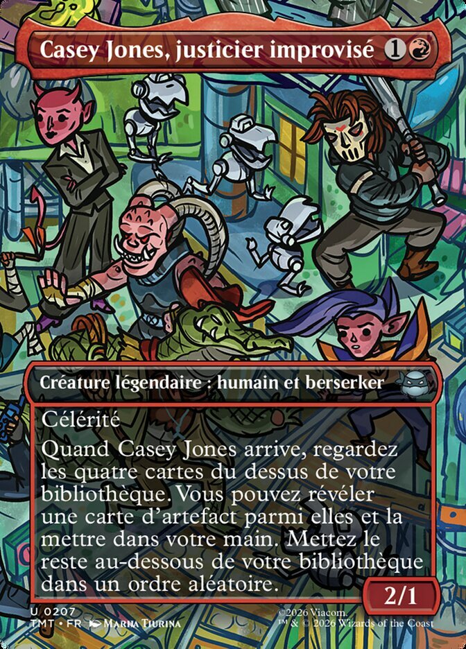 | Rules | Haste When Casey Jones enters, look at the top four cards of your library. You may reveal an artifact card from among them and put it into your hand. Put the rest on the bottom of your library in a random order. |