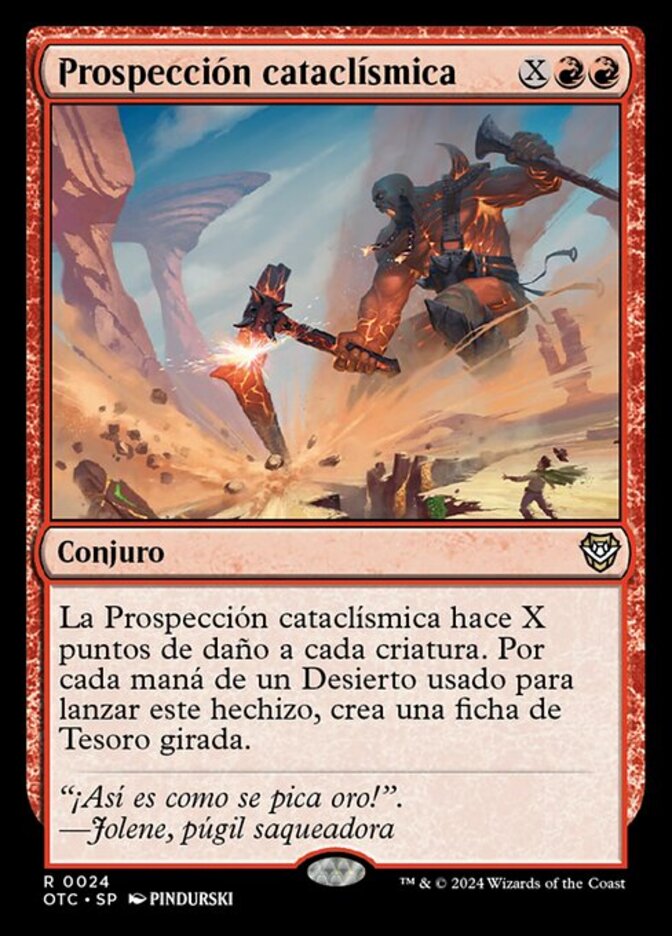 | Rules | Cataclysmic Prospecting deals X damage to each creature. For each mana from a Desert spent to cast this spell, create a tapped Treasure token. |