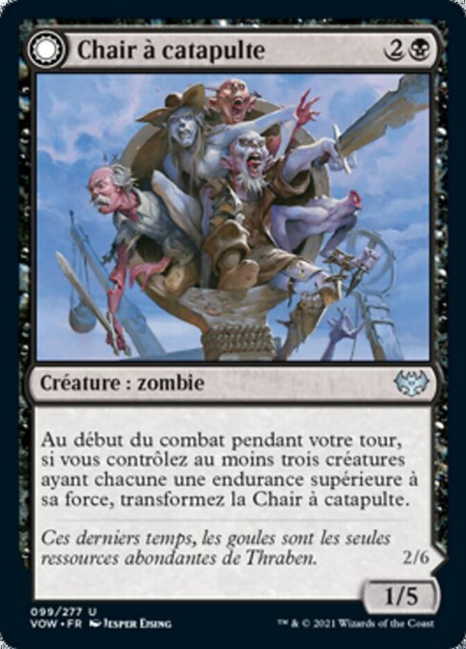 | Rules | At the beginning of combat on your turn, if you control three or more creatures that each have toughness greater than their power, transform Catapult Fodder. // , , Sacrifice another creature: Target opponent loses life equal to the sacrificed creature's toughness. |