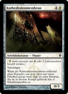 | Rules | ( can be paid with either or 2 life.) Defender When Cathedral Membrane dies during combat, it deals 6 damage to each creature it blocked this combat. |