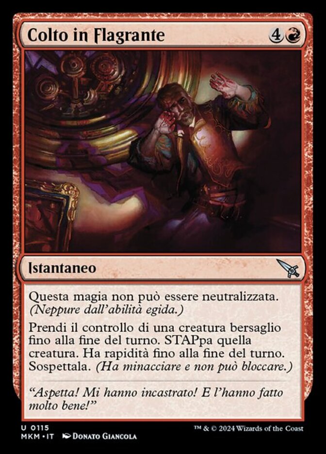 | Rules | This spell can't be countered. (This includes by the ward ability.) Gain control of target creature until end of turn. Untap that creature. It gains haste until end of turn. Suspect it. (It has menace and can't block.) |